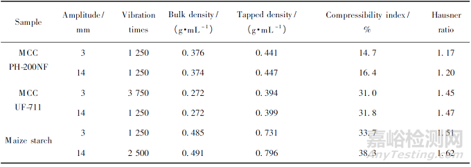 2.4 振幅對不同輔料的粉體壓縮性測定的影響