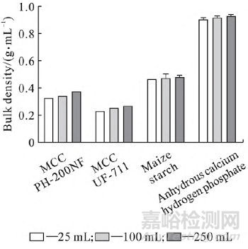 圖1 量筒體積對不同輔料的堆密度的影響對比