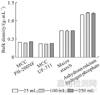 隨著量筒體積的減少,裝填量也較少,對下層物料的沖擊力減少,因而物料堆密度呈減小趨勢[11]。而量筒體積對振實(shí)密度的影響并無規(guī)律性,這應(yīng)該是振動強(qiáng)度或判斷試驗(yàn)結(jié)束標(biāo)準(zhǔn)不同所引起的數(shù)據(jù)差異。如參照《中華人民共和國藥典》( 2020 年版) 規(guī)定, 100 mL 量筒是以最后兩次振實(shí)體積差值小于2 mL 判斷試驗(yàn)結(jié)束( 與250 mL相同) ,除去無水磷酸氫鈣外,其他的物料可能并未達(dá)到完全振實(shí)狀態(tài),所以檢測到的振實(shí)密度較其他兩種量筒的數(shù)據(jù)小。因此,在考察不同種類輔料時,必須在同一條件下進(jìn)行檢測,盡量選擇容積為250 mL 的刻度量筒。