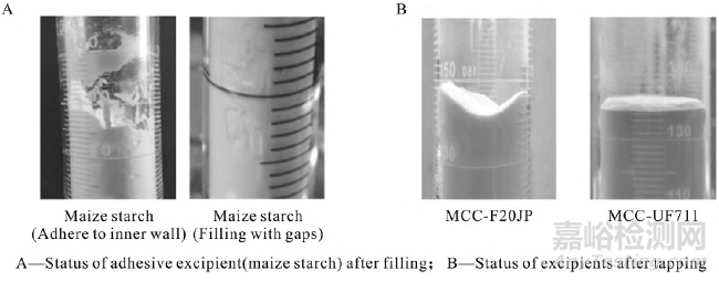 采用固定質(zhì)量法測定堆密度或振實(shí)密度的最大問題在于粉末表面不規(guī)整,影響讀數(shù)。例如在測定淀粉過程中,物料粘附在內(nèi)壁,如圖3A; 或振實(shí)后物料頂端呈非平整狀態(tài),如圖3B,均造成讀數(shù)困難,導(dǎo)致人為誤差較大[12]。抑或針對這一問題,目前采取的解決方案: 1) 用棉簽等刮去粘附在量筒壁上的淀粉,小心地使用刮板盡量撫平淀粉的表面,便于讀數(shù)( 但管壁有空隙時,需重新裝填) ; 2) 分別取三個最高點(diǎn)和最低點(diǎn),取最高點(diǎn)和最低點(diǎn)的平均值,作為實(shí)測值。如能細(xì)心熟練地使用上述兩種方法,對堆密度及振實(shí)密度的測定無顯著影響[13]。