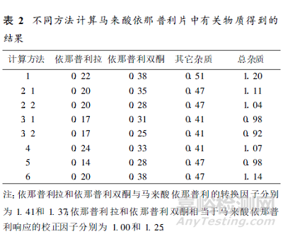 由于不同計算方法所表示的意義不同, 所以得出的結(jié)果也不相同。表2 就是某企業(yè)生產(chǎn)的馬來酸依那普利片, 按上述不同計算方法得出的雜質(zhì)的含量結(jié)果。