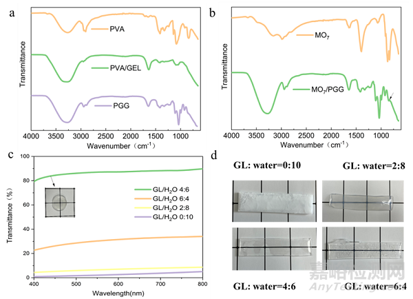 圖1. (a和b) 水凝膠樣品的FT-IR光譜。(c) 不同溶劑比的PGG水凝膠的透射率。(d) 不同溶劑比的PGG水凝膠的透明度展示。
