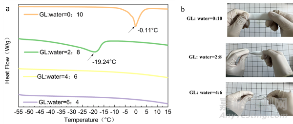 圖2. (a) 不同溶劑比例的PGG水凝膠的DSC測量。(b) 在-20℃下彎曲的水凝膠。