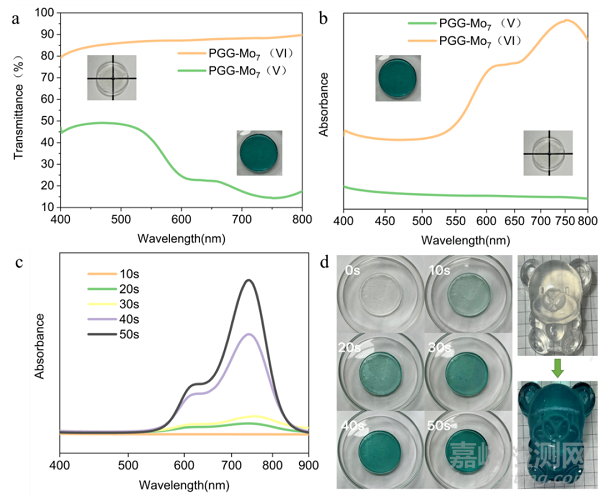圖3. (a) PGG-Mo7水凝膠的可見光透過率。(b) PGG-Mo7水凝膠的可見光吸收率。(VI:初始狀態(tài),V:還原狀態(tài))。(c) 水凝膠在不同時間內被紫外線照射的可見光吸收率。(d) 用紫外光照射不同時間的水凝膠的圖像,在照射熊后被紫外光照射變色。