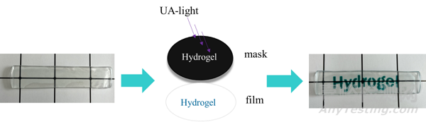 圖4. (a) 不同浸泡時間的PGG水凝膠在不同紫外線照射后的照片。(b) 利用紫外光在PGG-Mo7水凝膠上的可重寫成像過程。藍色區(qū)域表示用紫外光照射后顯示的圖案(紫外光照射時間T=30s,紫外光照射強度I=100%)。
