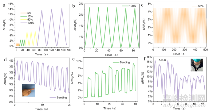 圖6. (a)和(b) PGG水凝膠傳感器分別對重復的小應變(5%、10%、20%、50%)和大應變(100%)的實時反應。(c) PGG水凝膠傳感器對50%恒定應變的50個拉伸循環(huán)的抗疲勞靈敏度。連接在不同身體關節(jié)上的PGN傳感器的實時相對電阻變化:(d)膝關節(jié)和(e)手指關節(jié)。(f) 混合水凝膠對人體微小運動的相對阻力變化。