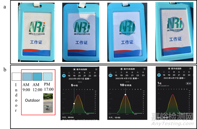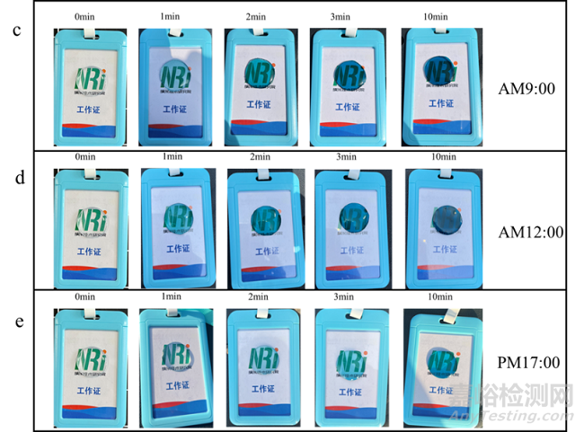 圖7. (a) 水凝膠在室內和室外的照片(在上午9點、12點和下午5點暴露在陽光下1分鐘)。(b) 一天中不同時間的紫外線指數(shù)。(c)(d)(e) 水凝膠在不同時間段10分鐘內褪色的照片。