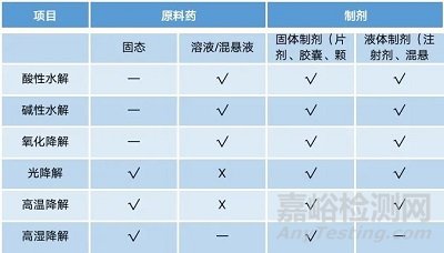 直接進(jìn)行固態(tài)和溶液的強(qiáng)降解試驗(yàn),如固態(tài)高溫、固態(tài)光照、溶液酸堿水解、溶液氧化,其余項(xiàng)目根據(jù)產(chǎn)品結(jié)構(gòu)和應(yīng)用需要進(jìn)行。
