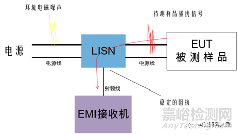 于是便有了LISN。它用于被測(cè)樣品(EUT)和電源輸入之間,來實(shí)現(xiàn)如下功能和需求: