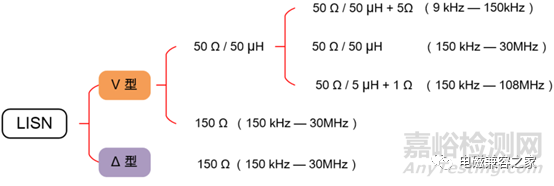 LISN有兩種基本類型:用于耦合不對(duì)稱電壓的V型和分別用于耦合對(duì)稱電壓和不對(duì)稱電壓的Δ型。在CISPR16標(biāo)準(zhǔn)中,分別規(guī)定了不同頻率范圍內(nèi)的LISN使用原則和類型,見圖4。