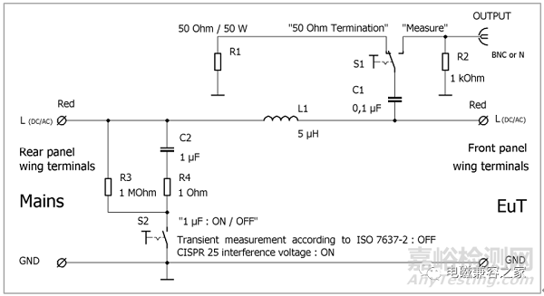 目前國(guó)內(nèi)EMC專業(yè)實(shí)驗(yàn)室依據(jù)的檢測(cè)標(biāo)準(zhǔn),使用多為50Ω/50µH V型LISN。下圖是一個(gè)滿足CISPR 25和ISO 7637-2規(guī)定的線路阻抗穩(wěn)定網(wǎng)絡(luò)。需要在正和負(fù)電源線上分別串入一個(gè)LISN。