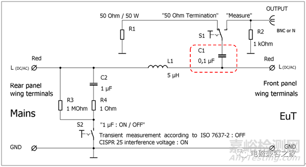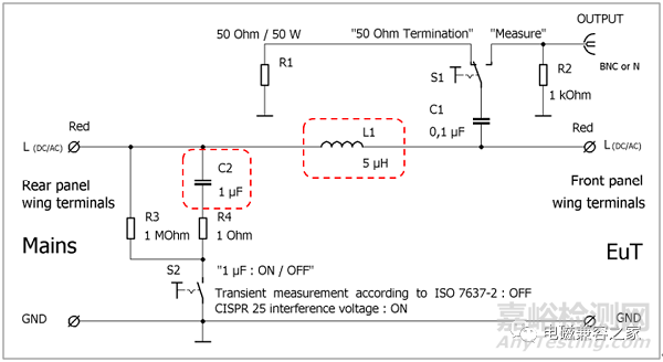 電路圖中1µF和5µH,用于過濾電網(wǎng)來自電網(wǎng)電源的干擾,為被測(cè)樣品提供“純凈”的電源。一個(gè)供電系統(tǒng)會(huì)連接多臺(tái)電子電氣設(shè)備,這些設(shè)備在工作的時(shí)候會(huì)將自身的噪聲引入供電網(wǎng)絡(luò)。這些電磁噪聲如果沒有經(jīng)過過濾(隔離),會(huì)被EMI接收機(jī)測(cè)量到,從而影響測(cè)試結(jié)果的準(zhǔn)確性和可重復(fù)性。