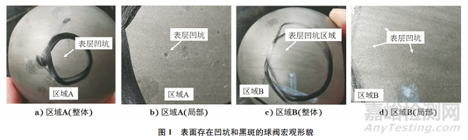 對表面存在凹坑和黑斑的球閥進(jìn)行宏觀觀察,結(jié)果如圖1所示。由圖1可知:球閥表面區(qū)域A分布有密集的凹坑和黑斑,個別凹坑直徑較大,深度較深,區(qū)域B與區(qū)域A形貌基本一致;表面凹坑的平均直徑約為0.18mm,最大凹坑直徑約為0.53mm,凹坑的平均間距約為1.86mm,分布較為密集。