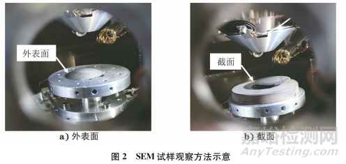 在球閥外表面和截面區(qū)域取樣,采用線切割的方法將試樣加工為片狀,然后用SEM進(jìn)行觀察,試樣觀察方法如圖2所示。