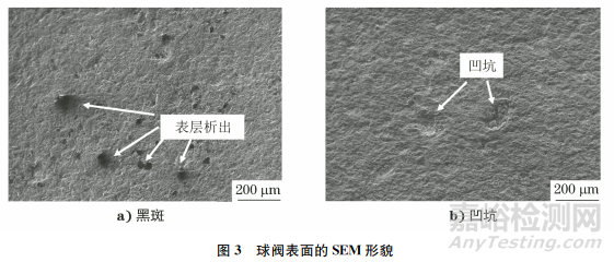球閥表面的SEM形貌如圖3所示,可見球閥表面滲碳不均勻,碳元素偏聚引起球閥表面出現(xiàn)塊狀析出,進(jìn)而形成圓形黑斑;黑斑和凹坑的分布都較為均勻、彌散,黑斑的平均直徑約為22μm,凹坑的平均直徑約為121μm,均屬于微觀缺陷。
