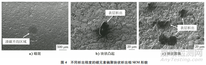 對不同析出程度的碳元素偏聚塊狀析出相進(jìn)行SEM觀察,結(jié)果如圖4所示。由圖4可知:在析出初期時,塊狀析出相以暗斑形式分布在球閥表面;隨著滲碳時效處理的時間不斷延長,該處形成碳元素偏聚,并在表面形成黑色塊狀凸起,甚至塊狀聚集形貌,此時黑色塊狀析出相附近并未產(chǎn)生明顯的凹坑形貌或其他析出相。