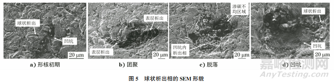 球閥表面部分析出相并未以塊狀凸起或聚集的形式繼續(xù)長大,而是形成球狀析出相,其SEM形貌如圖5所示。由圖5可知:在形核初期,球狀析出相尺寸較小,未形成團(tuán)聚,分布在塊狀析出相表面;隨著滲碳熱處理工藝的進(jìn)行,塊狀析出相長大、聚集,且其附近球狀析出相的尺寸開始增大,數(shù)量逐漸增多,并形成團(tuán)聚效應(yīng);隨著球狀析出相團(tuán)聚尺寸不斷增大,該處基體開始產(chǎn)生凹陷,并伴有基體組織損失,球狀析出相和塊狀析出相發(fā)生脫落;最終基體表面形成凹坑,凹坑周邊伴有球狀析出相的形貌組織。