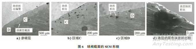 對球閥截面進(jìn)行SEM分析,結(jié)果如圖6所示。由圖6可知:滲碳層呈鋸齒狀,為熱處理和焊接過程中材料表層的典型形貌,球閥表層距離鋸尖的平均厚度為413μm,球閥表層距離齒根的平均厚度為352μm,滲碳層中分布有黑色塊狀析出相,該相與表層黑色塊狀析出相的形貌和尺寸基本一致,平均直徑為18μm,說明該相為滲碳濃度過高時基體內(nèi)析出的塊狀化合物顆粒;將滲碳層分為C和D兩個區(qū)域,區(qū)域C黑色塊狀析出相分布密集,黑色塊狀析出相平均間距約為35μm,且多靠近試樣表層;區(qū)域D黑色塊狀析出相平均間距為280μm,兩個區(qū)域析出相尺寸并無明顯變化;球閥表層的黑色塊狀析出相剝離于基體外,在試樣磨拋過程中并未發(fā)生形變,可推斷其為基體內(nèi)部和表層的硬質(zhì)顆粒質(zhì)點(diǎn)。