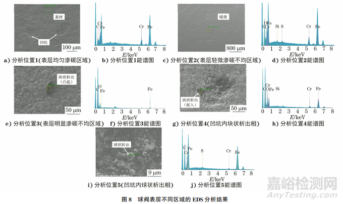 采用EDS分別對球閥表層不同區(qū)域進(jìn)行分析,結(jié)果如圖8所示。由圖8可知:球閥表層均勻滲碳區(qū)域無碳元素偏聚導(dǎo)致的黑色形貌;表層輕微滲碳不均區(qū)域存在因輕微碳元素偏聚而導(dǎo)致的黑色區(qū)域,但該偏聚未形成明顯析出相,形貌仍與基體保持一致;表層明顯滲碳不均區(qū)域存在因碳元素偏聚而導(dǎo)致的黑色塊狀析出相,且析出相附著于球閥表層,黑色塊狀析出相幾乎不含Cr元素,因此保持為黑色的塊狀碳化物;表層較嚴(yán)重滲碳不均區(qū)域因塊狀碳化物的交替析出、脫落而形成明顯凹坑,凹坑內(nèi)部區(qū)域?yàn)闈B碳不均的黑色區(qū)域,凹坑內(nèi)形成了大量球狀析出相,還有部分尚未脫落的黑色塊狀析出相;凹坑內(nèi)部球狀析出相附著于凹坑內(nèi)部黑色塊狀析出相表面,形成球狀團(tuán)聚,球狀析出相和塊狀析出相為共生析出狀態(tài),球狀析出相主要含有Fe、C元素,同時含有少量Cr元素。