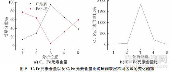 對O元素及干擾元素Si、S進(jìn)行計(jì)算排除,可得出C、Fe元素含量(質(zhì)量分?jǐn)?shù),下同)以及 C、Fe元素含量比隨球閥表層不同區(qū)域的變化趨勢(見圖9)。由圖9可知,均勻滲碳表面C、Fe元素含量比為18.9%,碳元素作為表面硬質(zhì)改性的少量添加元素,約占基體成分含量的1/5;黑色塊狀析出相中C、Fe元素含量比約為1825.3%,高濃度的碳元素形成偏聚效應(yīng),集合成硬質(zhì)質(zhì)點(diǎn),約為基體成分的18倍,其他區(qū)域的C、Fe元素含量比均介于18.9%~1825.3%。