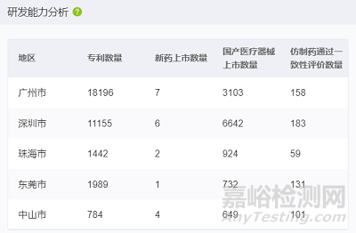 從研發(fā)能力看,截止2023年4月底,專利數(shù)量方面,廣州有18196個、深圳有11155個、珠海有1442個、東莞有1989個、中山有784個;新藥上市數(shù)量方面,廣州有7個、深圳有6個、珠海有2個、東莞有1個、中山有4個;國產(chǎn)醫(yī)療器械上市數(shù)量方面,廣州有3103個、深圳有6642個、珠海有924個、東莞有732個、中山有649個;仿制藥通過一致性評價數(shù)量方面,廣州有158個、深圳有183個、珠海有59個、東莞有131個、中山有101個。