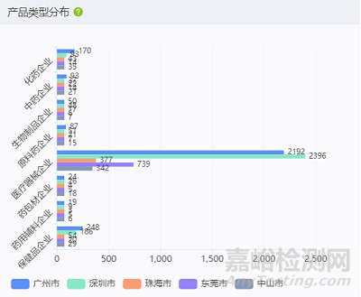 從產(chǎn)品類型分布看,截止到2023年4月底,化藥企業(yè)廣州170家、深圳93家、珠海43家、東莞14家、中山35家;中藥企業(yè)廣州93家、深圳47家、珠海22家、東莞14家、中山21家;生物制品企業(yè)廣州50家、深圳48家、珠海17家、東莞6家、中山7家;原料藥企業(yè)廣州87家、深圳51家、珠海21家、東莞7家、中山15家;醫(yī)療器械企業(yè)廣州2192家、深圳2396家、珠海377家、東莞739家、中山342家。