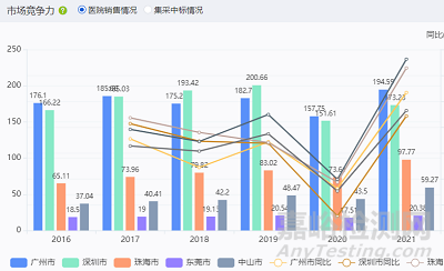 從醫(yī)藥銷售情況看,從2016年至2021年,廣州市、深圳市、珠海市、東莞市、中山市企業(yè)的醫(yī)院銷售累計金額分別為1072.14億、1070.18億、473.29億、115.06億、270.89億。