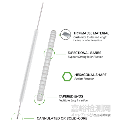 生物復(fù)合帶線鉚釘由磷酸三鈣 (TCP) 或羥基磷灰石 (HAP) 等可再吸收材料制成。