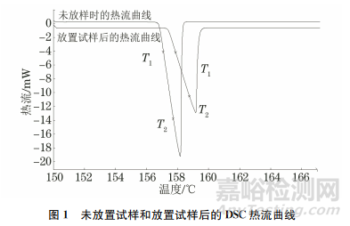 圖1為未放置試樣和放置試樣后的 DSC熱流曲線,分別在兩條曲線熔融峰下降段的線性范圍內(nèi)選取兩個溫度點T1和T2,較低點應高于外推起始溫度之上10%,并計算兩條熔融曲線下降段的斜率。