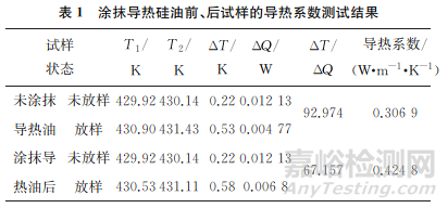表1為涂抹導熱硅油前、后試樣的導熱系數(shù)測試結果,可見試樣表面涂抹導熱硅油,可有效減少接觸面的空氣熱阻,導熱系數(shù)有所增加,且該測試結果與激光閃光法的測試結果(λ=0.4285W·m-1·K-1)基本一致,說明涂抹導熱硅油試樣的測試結果較為準確、可靠。