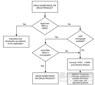 USP在2017年新建立了一個通則<476, 原料藥與制劑的雜質(zhì)控制>,主要內(nèi)容是藥典各論中已有的原料藥與制劑中雜質(zhì)分析測試與控制,提出了有機雜質(zhì)控制決策樹,如下圖,具體內(nèi)容可參考PF43(6)。