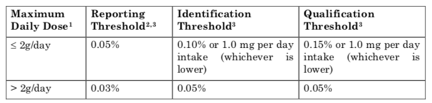 隨著臨床的研究進展,收集藥品的臨床前和臨床安全性數(shù)據(jù)以支持雜質(zhì)限度的進一步優(yōu)化。對于沒有毒理數(shù)據(jù)支持的原料藥雜質(zhì)限度制定可以參考ICH Q3A指南,如表1。