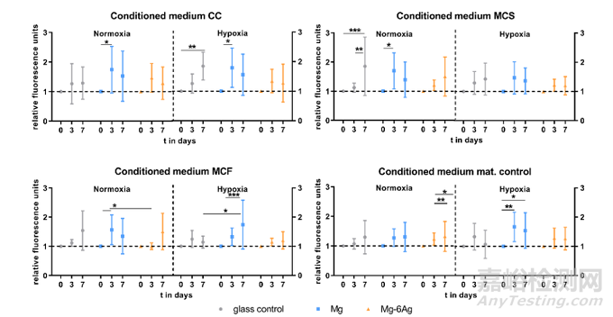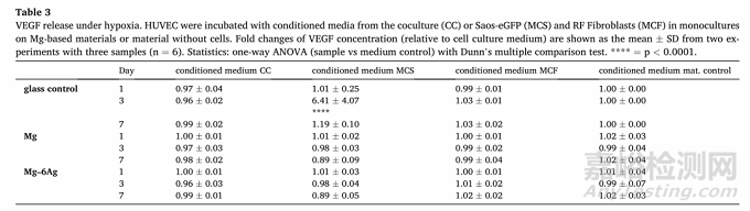 用HUVEC間接模型研究癌癥誘導(dǎo)血管生成。首先,如圖6所示,普通培養(yǎng)基中Mg2+的濃度約為0.8 mM,實驗組培養(yǎng)基分別加入含可降解的Mg和Mg-Ag材料。隨與細(xì)胞共孵育時間的增加,培養(yǎng)基中游離的Mg2+濃度逐漸升高到3-6 mM,且Mg2+的釋放與氧氣濃度和孵育細(xì)胞無關(guān)。研究表明,腫瘤相關(guān)血管生成是由ECM的降解內(nèi)皮細(xì)胞的上皮間質(zhì)轉(zhuǎn)化導(dǎo)致的。圖7探索了含鎂材料和不含鎂材料條件對人臍靜脈內(nèi)皮細(xì)胞(HUVEC)的影響。常氧條件下,第3-7天內(nèi)皮細(xì)胞間連接通透性明顯增加,而在缺氧條件下改變不明顯。在第7天,HUVEC與來自對照組的細(xì)胞的條件培養(yǎng)基(CC、MCS、MCF)孵育時,其滲透性略高于與含鎂材料的條件培養(yǎng)基共培養(yǎng)組。VEGF是血管生成最重要的介質(zhì)之一,可形成新血管。因此,測量了條件培養(yǎng)基培養(yǎng)HUVEC后的上清液中VEGF濃度(Table 3)。含鎂材料培養(yǎng)基和對照培養(yǎng)基共培養(yǎng)并未引起明顯不同的VEGF釋放,相反,HUVEC與低氧條件下對照組的培養(yǎng)基孵育,可在第3天顯著增加VEGF濃度。
