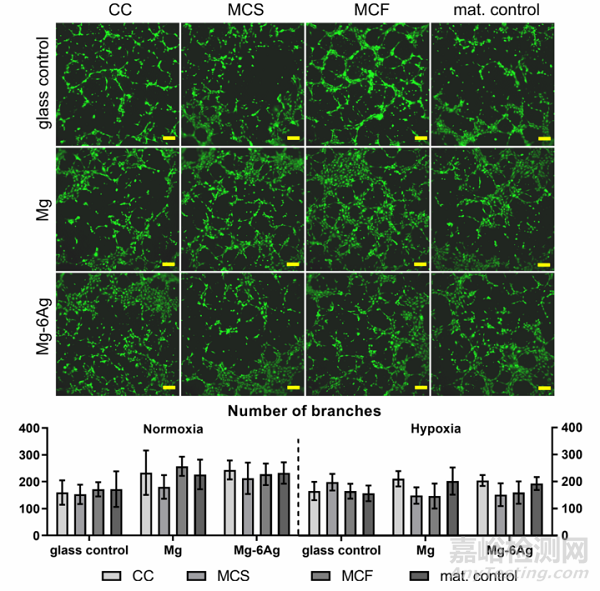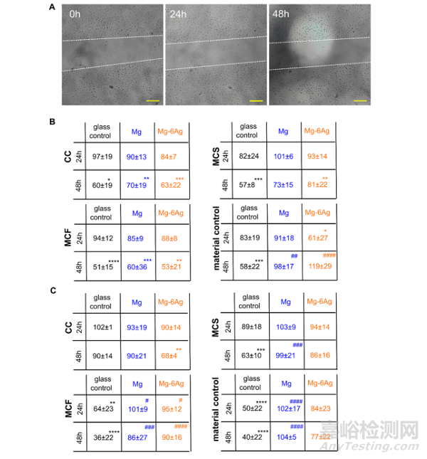 圖9證明了在常氧(圖9B)和缺氧(圖9C)條件下,在不同條件介質(zhì)中孵育48 h后HUVEC的遷移(圖9A)。常氧條件下,含鎂材料并不影響HUVEC的遷移,但翻樣條件下,可顯著降低HUVEC的遷移,從而抑制腫瘤相關(guān)血管生成。