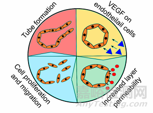 在臨床上,骨肉瘤診斷表明有15-20%的轉(zhuǎn)移率,伴隨著高死亡率和嚴(yán)重并發(fā)癥。腫瘤細(xì)胞的轉(zhuǎn)移過程伴隨著上皮間充質(zhì)轉(zhuǎn)化(EMT),E-鈣粘素(E-cadherin)蛋白下調(diào),及波形蛋白(vimentin)和基質(zhì)金屬蛋白酶(matrix metalloproteinases, MMP)的上調(diào)。在腫瘤微環(huán)境中,癌細(xì)胞與癌旁組織細(xì)胞發(fā)生密切的信號交流以誘導(dǎo)腫瘤細(xì)胞的持續(xù)轉(zhuǎn)移,例如成纖維細(xì)胞和巨噬細(xì)胞。腫瘤細(xì)胞經(jīng)常利用癌旁組織釋放的金屬蛋白酶MMP-2和MMP-9來降解癌細(xì)胞周圍的基質(zhì),促進腫瘤細(xì)胞進入到血管中,隨血液循環(huán)到達(dá)新的部位產(chǎn)生繼發(fā)性腫瘤。惡性腫瘤快速的增殖需要血管運輸大量的氧氣和營養(yǎng)物質(zhì),當(dāng)腫瘤中心區(qū)域缺氧(O2<3%)且營養(yǎng)不良時,就會導(dǎo)致腫瘤血管異質(zhì)性。研究表明,血管內(nèi)皮生長因子(vascular endothelial growth factor, VEGF)是血管生成最重要的因子之一,幾乎參與了血管生成的所有步驟。排列在腫瘤血管壁上的內(nèi)皮細(xì)胞之間間隙增大,有利于腫瘤細(xì)胞滲透到血管內(nèi),同時內(nèi)皮細(xì)胞也會增殖和遷移以形成性的腫瘤血管,并與新的內(nèi)皮細(xì)胞發(fā)生連接(如圖1所示)。本研究內(nèi)容表明,Mg2+可顯著影響骨肉瘤細(xì)胞的遷移和侵襲,并改善腫瘤血管異質(zhì)性。