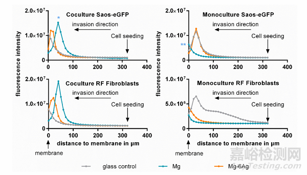 Fig. 3. Cell invasion influenced by Mg and Mg–6Ag. Cells invaded through an ECM mimetic gel layer from the point of cell seeding (320 μm) to the membrane (0μm). Fluorescence intensities of representative z-stack (10 μm steps) images are shown. Statistics: ordinary one-way ANOVA with Dunnett’s multiple comparison test(n = 12); * = p < 0.01, ** = p < 0.01.