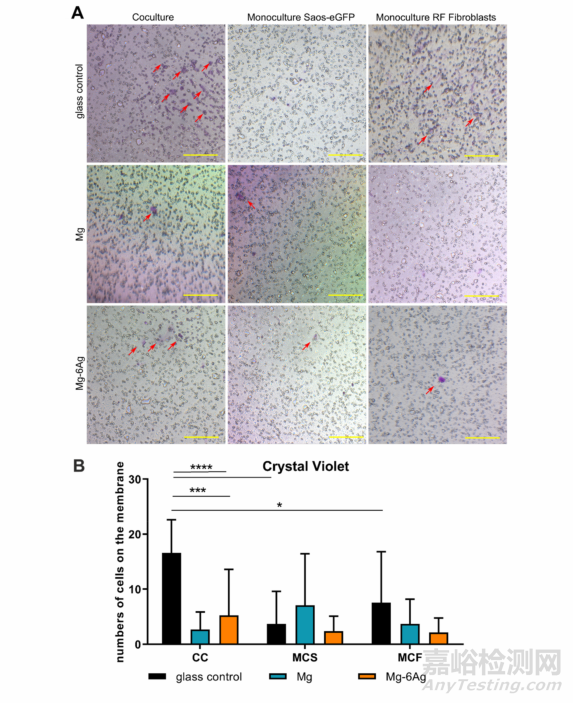此外,為研究含鎂材料對癌細(xì)胞侵襲能力的影響,作者將骨肉瘤細(xì)胞(Saos-eGFP)和成纖維細(xì)胞單獨或共同接種于帶有ECM凝膠的小室中,底部加入細(xì)胞培養(yǎng)基或經(jīng)過Mg或Mg-Ag材料處理的培養(yǎng)基,通過檢測細(xì)胞向下侵襲的熒光強度來代表細(xì)胞的侵襲能力。圖3表明,骨肉瘤細(xì)胞和成纖維細(xì)胞共同接種于含Mg材料或Mg-Ag材料的轉(zhuǎn)移小室中,兩種細(xì)胞的侵襲能力均明顯降低;但兩種細(xì)胞單獨與含Mg材料或Mg-Ag材料共培養(yǎng)時,細(xì)胞的侵襲能力與對照組相比稍有增加。圖4對圖三中穿過ECM的細(xì)胞進行結(jié)晶紫染色,并得出一致結(jié)論。