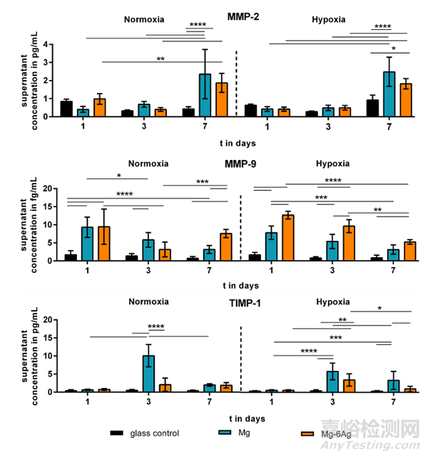 腫瘤組織中高水平的金屬蛋白酶會導(dǎo)致ECM降解,促進單個腫瘤細(xì)胞遷移并侵襲進入到血管中。圖5顯示Mg或Mg-Ag材料共培養(yǎng)腫瘤細(xì)胞會促進MMP-2、MMP-和TIMP-1分泌增加,共培養(yǎng)7天后,MMP-2的分泌量是對照組的2-3倍;MMP-9在含鎂材料的共培養(yǎng)條件下也顯著增加,但隨共培養(yǎng)的時間呈下降趨勢;而TIMP-1僅在第三天有明顯增加,且Mg共培養(yǎng)的效果優(yōu)于Mg-Ag。