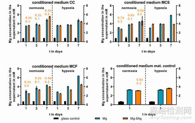 Fig. 6. Supernatant Mg and Ag concentration of conditioned media. Saos-eGFP and RF Fibroblasts were seeded as a 1:1 coculture (CC) or monocultures (Saos-eGFP:MCS, RF Fibroblasts: MCF) on Mg, Mg–6Ag or glass (glass control). Furthermore, material without cells served as a mat. control. After one, three and seven days,conditioned medium was harvested, and Mg (in mM) and Ag (orange numbers, in μM) concentration were measured as described previously.