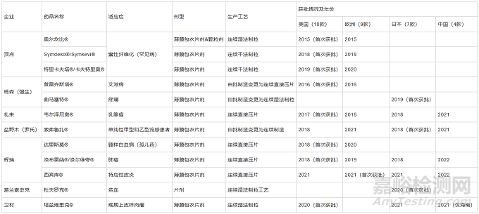 表1近年來使用連續(xù)工藝生產(chǎn)的企業(yè)與獲批藥物