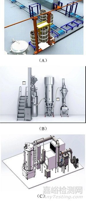圖2 吊籃式循環(huán)提取示意圖(A)、高密閉連續(xù)制粒線(B)、中藥丸劑連續(xù)干燥系統(tǒng)(C)外觀示意圖