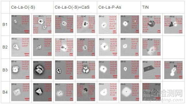B1~B4樣品中均檢測到TiN夾雜,大多呈不規(guī)則形。其中部分TiN附著在稀土夾雜物的外圍或周邊如圖2(h)、(i)所示,部分獨立存在如圖2(j)所示。