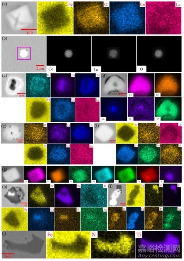 (a)、(b) Ce-La-O(-S) ;(c)、(d)、(e) Ce-La-O(-S)+CaS;(f)、(g) Ce-La-P-As;(h)、(i)、(j) TiN。