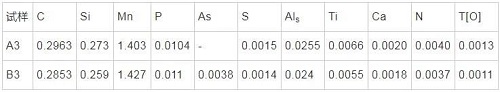 取樣方案見表1。分別在兩爐次澆注過程中大包余鋼110 t(A1和B1)、80 t(A2和B2)時用鋯質(zhì)取樣器在中間包內(nèi)取樣,并在鑄坯(A3和B3)和軋材(A4和B4)上分別取樣。