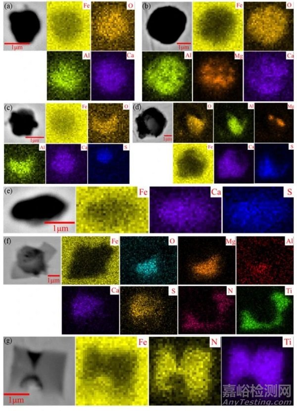 (a)、(b) Ca-Al(-Mg)-O;(c)、(d) Ca-Al(-Mg)-O+CaS;(e) CaS;(f)、(g) TiN。