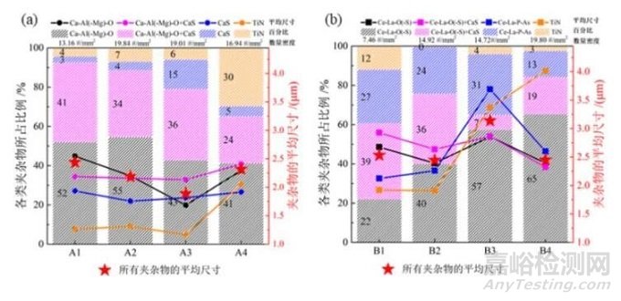 用夾雜物自動掃描分析儀分別掃描磨拋后的A1~A4和B1~B4金相樣品,掃描面積均為20 mm2左右。設(shè)定掃描的夾雜物最小尺寸為1 μm。統(tǒng)計夾雜物的數(shù)密度、類型和各類夾雜物的所占比例和平均尺寸,結(jié)果如圖3所示。其中陰影和數(shù)字表示各類夾雜物所占比例,圓點和方點表示各類夾雜物的平均尺寸,表示各樣品中所有夾雜物的平均尺寸。
