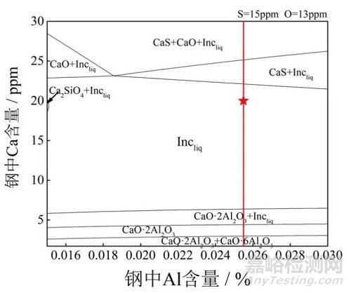 針對方案A,選用Factsage 8.2的Phase Diagram模塊和FT oxid、FT msic數(shù)據(jù)庫,設(shè)置計算溫度為1600 ℃,鋼水成分按表2中試樣A3的基礎(chǔ)成分,作Al-Ca平衡關(guān)系圖,如圖4所示。可以看出在給定鋁含量下,隨著鋼中鈣含量增加(圖4中紅線),夾雜物的轉(zhuǎn)變路徑為Al2O3→ CaO·6Al2O3→ CaO·2Al2O3→ 液態(tài)夾雜物(Incliq)→ Incliq+CaS→ Incliq+CaS+CaO。軟件中液態(tài)夾雜物默認(rèn)為CaO·Al2O3、12CaO·7Al2O3和3CaO·Al2O3。A3試樣鋁和鈣質(zhì)量分?jǐn)?shù)分別為0.0255%和0.002%,即圖中紅點所在位置,因而形成的夾雜物主要為液態(tài)夾雜物Ca-Al-O,試驗中檢測到比例最大的夾雜物是Ca-Al-(Mg)-O(如圖3(a)),與計算相符。其中個別夾雜物中所含的少量鎂是由耐材侵蝕造成,計算時沒有考慮侵蝕。另外,試驗中也檢測到大量的Ca-Al(-Mg)-O +CaS夾雜物,這是由于石油套管鋼實際生產(chǎn)過程中,鈣線喂入的區(qū)域鈣局部濃度較高,超過了圖4中紅線與黑線相交處的鈣濃度,因而會與硫結(jié)合形成CaS夾雜析出,然后與Ca-Al(-Mg)-O碰撞或黏附在一起從而形成如圖1(c)和(d)所示的不同形貌的復(fù)合夾雜物。