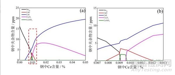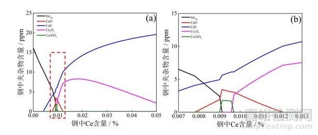 (a)夾雜物含量隨鈰含量的變化;(b)圖(a)中紅框區(qū)域放大圖。