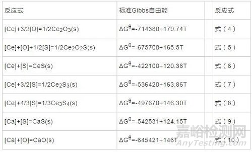 Table 7 Standard Gibbs free energies of 1mol Ce reacted in molten iron