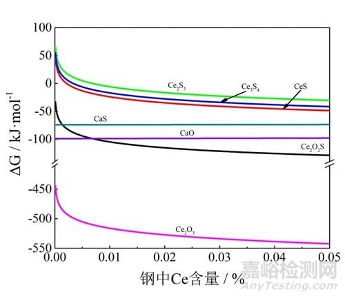 表7 1mol 鈰在鐵液中反應(yīng)的標(biāo)準(zhǔn)Gibbs自由能